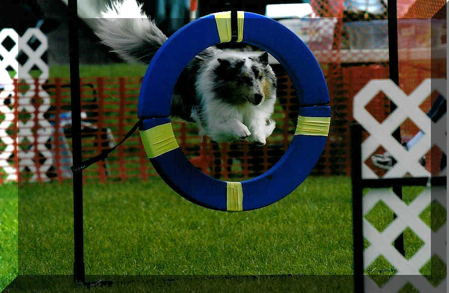 Paris and Tanna playing under the trampoline! A few Shelties wondering why is it more fun up top on the trampoline!